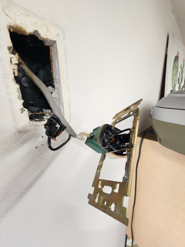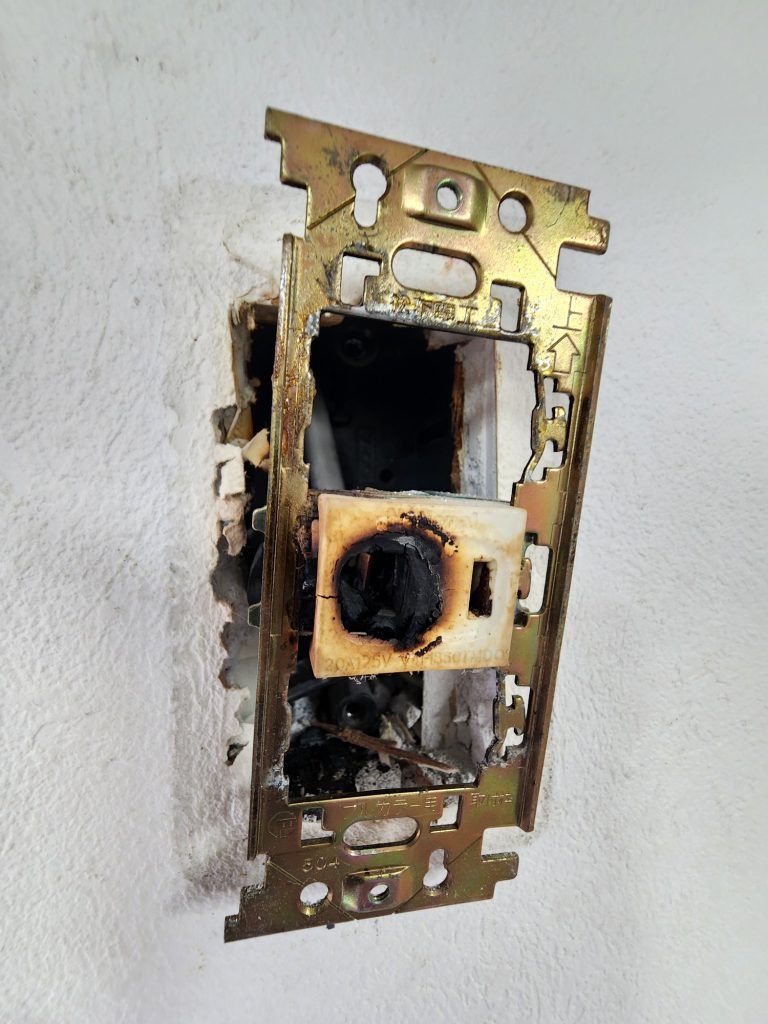 壁から取り外したコンセント本体の様子です。黒く焦げ、激しく焼けているのが分かります。