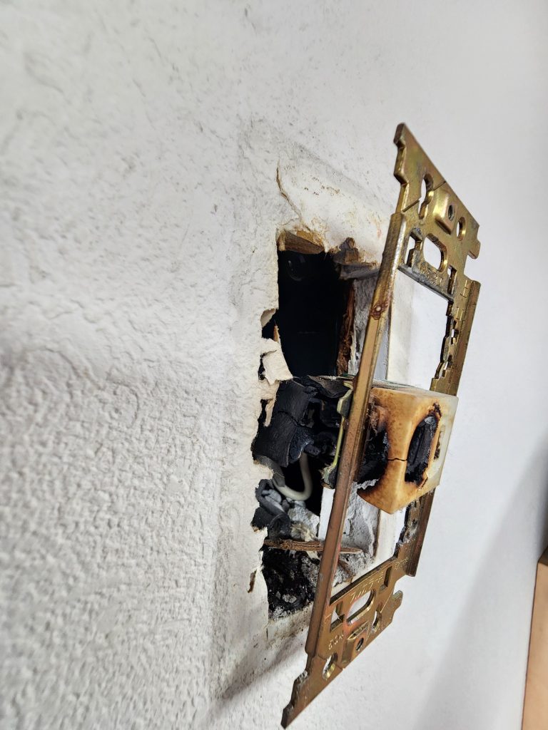 壁の中の配線も焼損しています。火が内部まで広がったことがうかがえます。